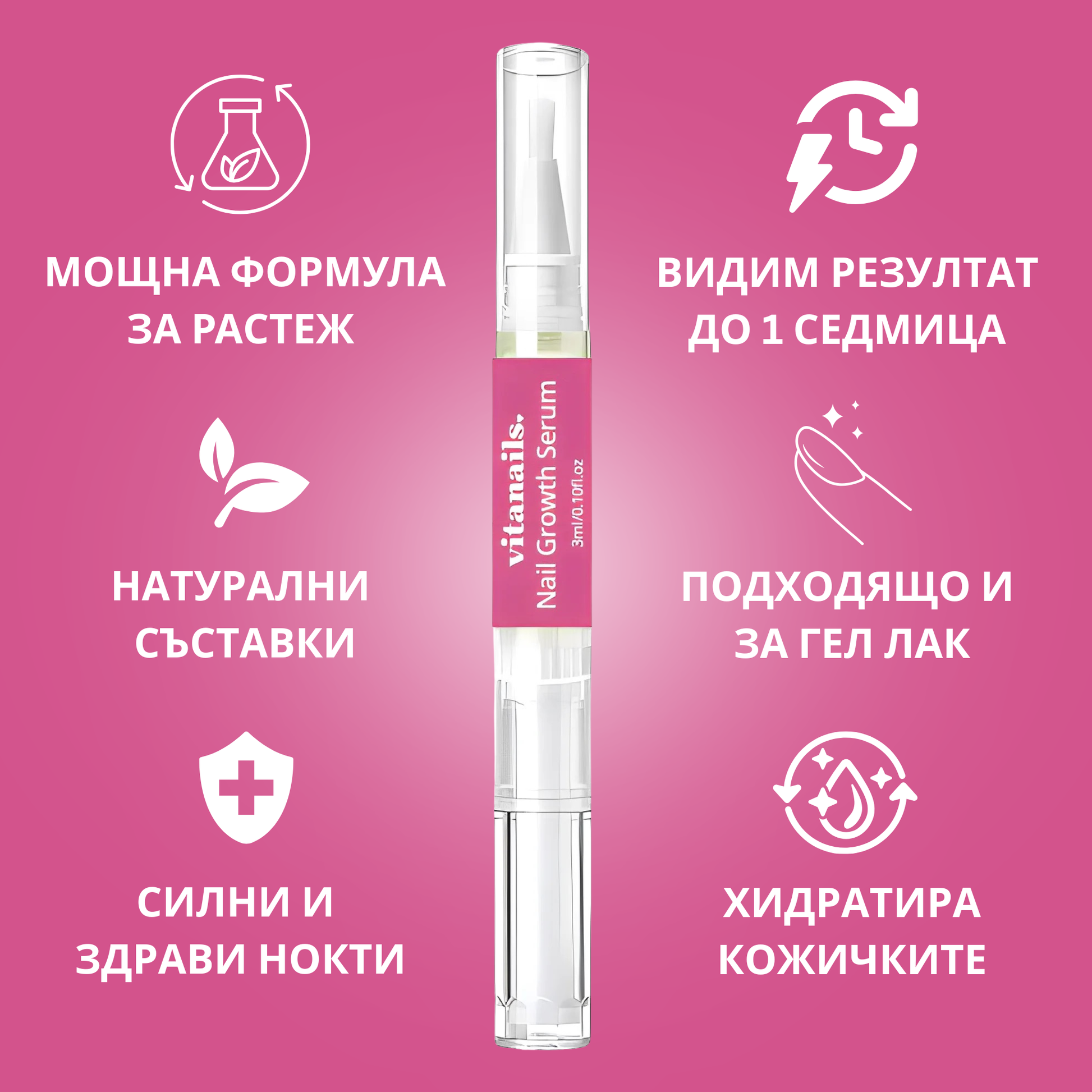 Забрави за чупливите, сухи и бавно растящи нокти. С писалката VitaNails ще постигнеш естествен блясък, здравина и видим растеж – без салонни процедури и излишни разходи. Писалката съдържа мощна комбинация от натурални масла, витамини и растителни екстракти, които проникват в нокътната плочка, подхранват я отвътре и стимулират растежа. Само 1 минута дневно са достатъчни, за да хидратираш и омекотиш кожичките, укрепиш и възстановиш ноктите и ги поддържаш гладки, блестящи и еластични. Нежна към ноктите и кожата – без парабени, без вредни химикали и без мазен слой. Подари си здрави и красиви нокти – всеки ден, навсякъде. VitaNails – красота, заключена в една писалка.